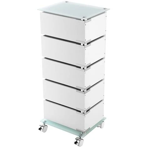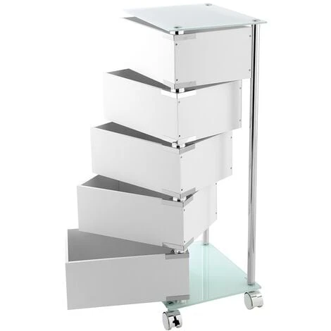 Carrello in acciaio cromato con ripiani in vetro temperato satinato, ruote con fermo e 5 cassetti girevoli