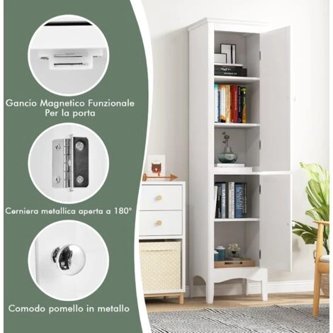 Realizzato in MDF selezionato con superficie verniciata, questo sottile mobile da bagno mostra grande resistenza e stabilità. Le 2 ante e i 4 ripiani rendono gli oggetti all’interno puliti e ordinati. Modificando la posizione del ripiano regolabile dietro l’anta inferiore, è possibile riporre oggetti di varie altezze. Il dispositivo antiribaltamento in dotazione evita cadute accidentali e crea un ambiente sicuro. Le ante a battente, la modanatura a corona superiore e la forma ad arco inferiore aggiungono un tocco di freschezza alla vostra casa. Inoltre, l’armadietto a pavimento stretto occupa poco spazio, pur offrendo un’ampia superficie di stoccaggio. È un complemento perfetto per il bagno, il soggiorno, la camera da letto, ecc.