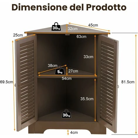 - Armadio Angolare Salvaspazio:L’armadietto angolare con dimensioni 63 cm x 32 cm x 81,5 cm è adatto a stanze con spazio limitato, e può ospitare vasi, cornici per foto o altri ornamenti sul suo piano d’appoggio triangolare.