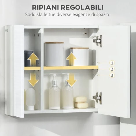 Uno spazio sempre elegante e ordinato richiede molto impegno: questo mobile da bagno con specchio di kleankin è la combinazione di praticità e bellezza per aiutarti in questo arduo compito. L’armadio a specchio offre spazio sufficiente per sistemare tutti i tuoi articoli da bagno e aiutarti nella routine mattutina. I ripiani regolabili offrono diverse possibilità di sistemazione degli articoli e il design della porta dell’armadio con specchio è comodo e rende il bagno ordinato e pulito.