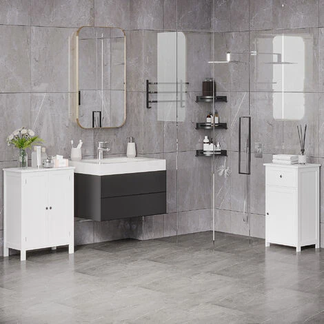 Completa il tuo bagno o la tua cucina con questo mobile Kleankin, progettato per integrarsi in qualsiasi bagno moderno. Il suo design salvaspazio è ideale per le toilette di piccole dimensioni, offrendo un ampio spazio per articoli da bagno e prodotti per la pulizia. L’armadietto è disponibile in finitura bianca, con due ripiani interni regolabili su tre livelli per soddisfare le tue esigenze di contenuto di varie dimensioni. Il mobile ha 2 ante con maniglie in metallo cromato per una facile apertura e chiusura. L’intero set si presenta elegante e funzionale, migliorerà l’arredamento del tuo bagno.