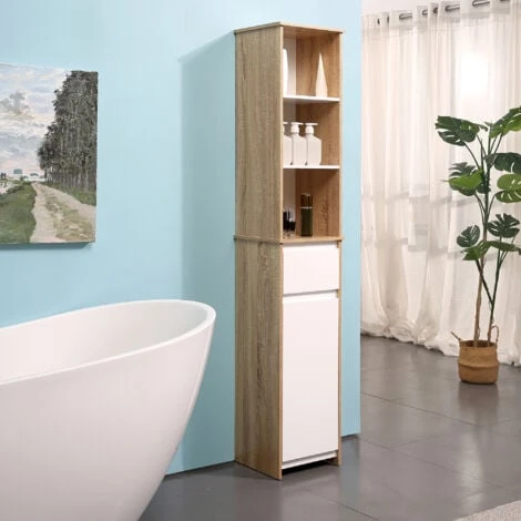 Massimizza lo spazio e riduci il disordino con questo scaffale per il bagno Kleankin. Progettato per sfruttare al massimo ogni angolo, ha una struttura stretta che si sviluppa in verticale ed è composto da 3 mensole, un armadietto e un cassetto. Tutto il mobile è costruito con pannelli truciolari e, grazie al suo stile minimal e discreto, si integra alla perfezione con ogni tipo di arredo: anche il tuo!