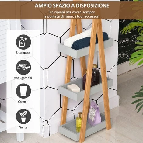 Non hai ancora trovato lo scaffale giusto per il tuo bagno? Allora non puoi perdere questo mobiletto Kleankin! Costruito con legno di bambù, ha dimensioni compatte e 3 comode mensole in cui puoi sistemare tutti i tuoi prodotti. Il suo design minimalista dalla forma piramidale è perfetto per ogni tipo di arredo, e per dare un tocco di stile al tuo ambiente.