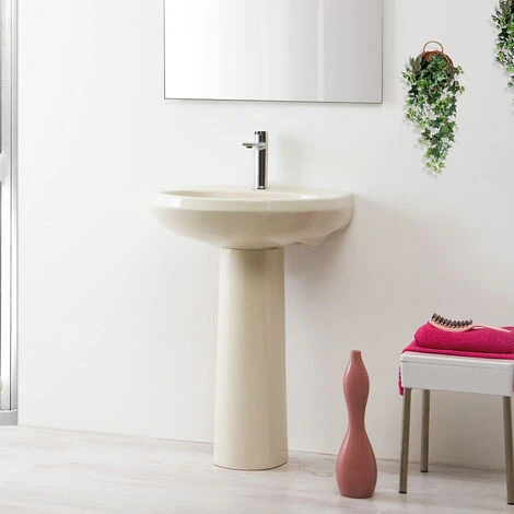 Lavabo 58 63 cm dallo stile classico e dalle forme semplici di un tempo, è realizzato in ceramica colore Champagne. Ha un’installazione su colonna ed una rubinetteria monoforo o tre fori.