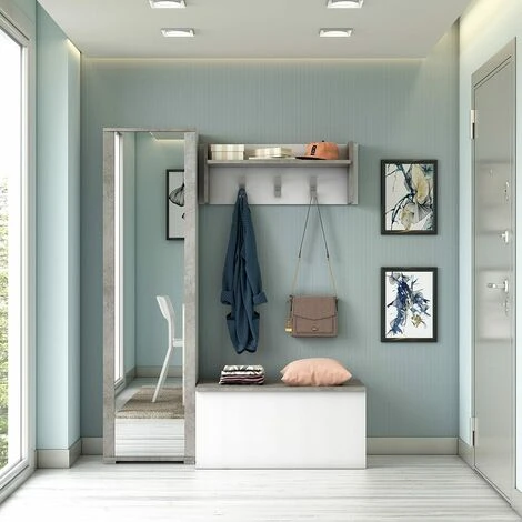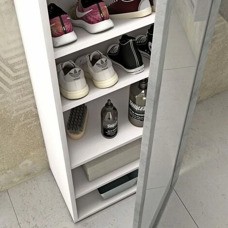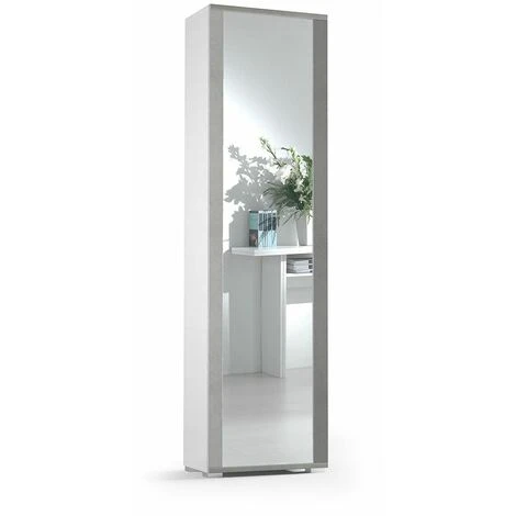 Il mobile a colonna con anta a specchio è la soluzione salvaspazio adatta ad ogni esigenza. Grazie alla profondità di appena 31cm, può essere collocata facilmente in ogni ambiente per aumentare la capacità di stoccaggio, grazie ai 7 ripiani regolabili, e riporre in modo ordinato scarpe, spugne o oggetti di qualsiasi tipo. Inoltre, la specchiera a tutt’anta, riflettendo la luce, contribuisce a rendere la stanza più chiara ed ariosa. La struttura è composta da robusti pannelli di legno nobilitato bianchi con il tocco moderno del telaio grigio effetto cemento dell’anta.
