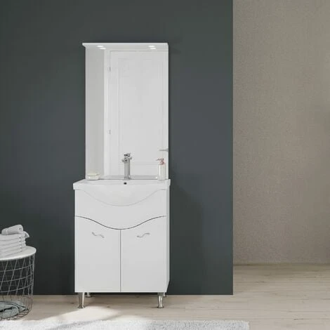 MOBILE BAGNO A TERRA 65 CM CON ANTE, LAVABO E SPECCHIO CON FARETTI LED BIANCO LUCIDO