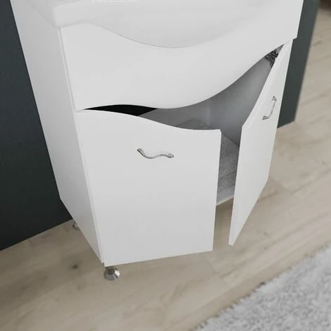 La collezione Easy, si amplia con una nuova proposta, il mobile bagno da 65 cm a terra con due ante, lavabo e specchio. La base presenta i laterali in legno nobilitato laccato UV rifinito in bianco lucido, mentre i frontali sono in mdf rivestiti in pressa con PVC bianco lucido con pellicola di protezione. Le ante sono dotate di due maniglie in metallo cromato. I piedini sono regolabili ed in abs cromato. Il lavabo, dotato di una vaschetta estremamente capiente, è in ceramica di prima qualità. La composizione si completa con una specchiera fornita di illuminazione.
