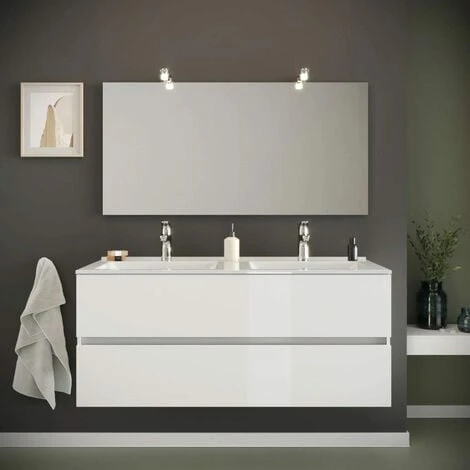 MOBILE BAGNO 120 CM BIANCO LUCIDO CON DOPPIO LAVABO IN CERAMICA E SPECCHIO A FILO