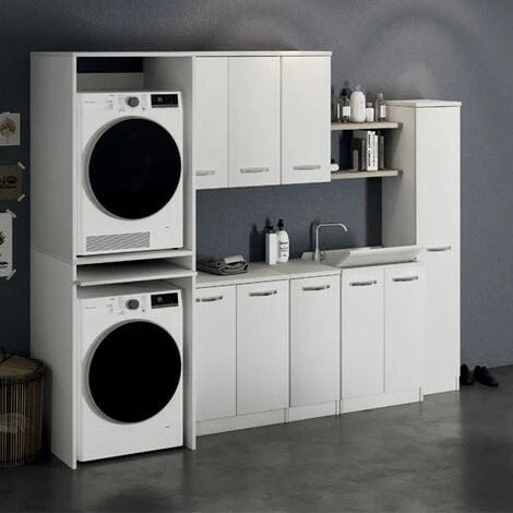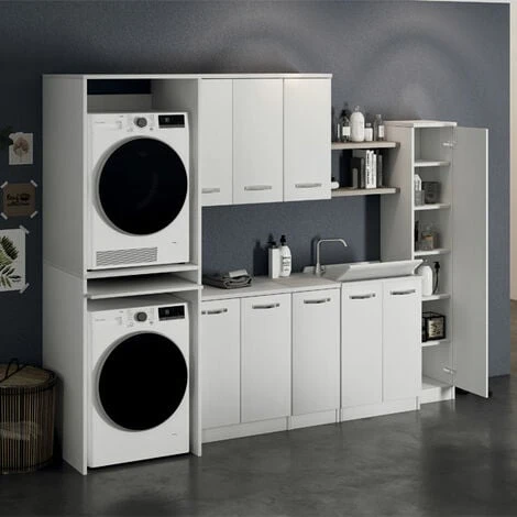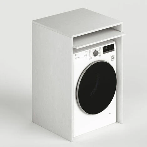 Mobile coprilavatrice in legno colore bianco frassinato con ripiano estraibile, ideale per occultare o proteggere la lavatrice in lavanderia.