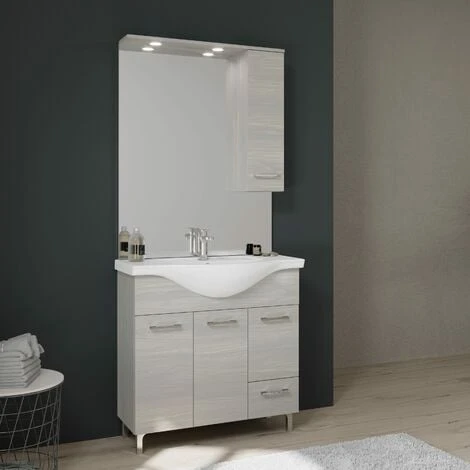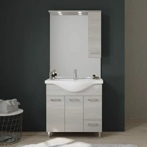 Kiamami Valentina, arredo e accessori per il bagno, propone questo mobile bagno con piedini nella delicata finitura quercia grigio. Questa composizione ha uno stile tradizionale, ed è composta da una base con lavabo in ceramica e uno specchio con pensile. La base assicura la massima capacità contenitiva grazie alle 3 ante e al cassetto inferiore che ha una larghezza di 27 cm ed è alto 17 cm. Il lavabo in ceramica dispone di un’ampia vasca centrale con due piccole zone d’appoggio laterali. Lo specchio oltre ad assicurare una comoda superficie riflettente è altrettanto funzionale grazie al pensile a destra dotato di due ripiani fissi. La specchiera è illuminata in quanto dotata di lampada a led collocata sul bordo superiore della stessa.