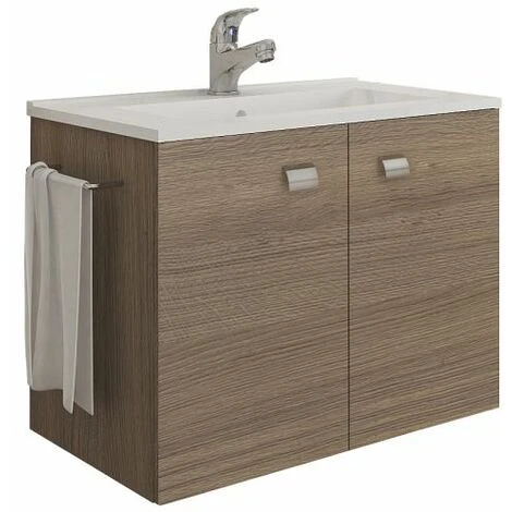struttura in legno. Due ante. Completo di lavabo integrale (escluso rubinetto). Con portasalviette. Dimenisone cm 61x36x47h Colore rovere fumo