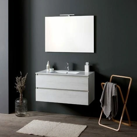 La serie Berlin di mobili bagno sospesi si amplia con questo mobile bagno con due cassetti grigio chiaro nella misura da 90cm. L’offerta si completa con un lavabo in ceramica e specchio con lampada led. La base è costituita dal mobiletto sospeso con lavabo integrato in ceramica bianca e due cassetti. Questi sono completamente estraibili per assicurare la massima capacità contenitiva, grazie anche alla spondina laterale metallica, e hanno la chiusura ammortizzata, per evitare colpi quando viene chiuso. Lo specchio ha uno spessore di soli 2cm e il bordo è a filo lucido, reversibile e sul lato superiore è dotato di applique led.