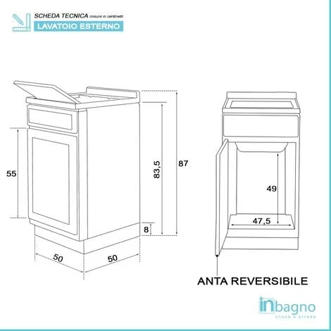 - Tipologia: mobile lavatoio con ampia vasca, 1 anta e tavoletta d’appoggio;