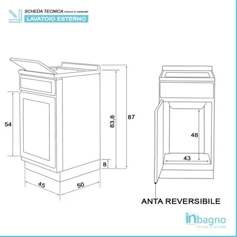 Sul lavatoio è possibile praticare un foro sia a destra che a sinistra per il rubinetto. In alternativa si può optare per un miscelatore a muro. Nella parte posteriore è aperto, ad eccezione di 2 traverse, superiore ed inferiore, ideate e realizzate per una migliore stabilità a terra.