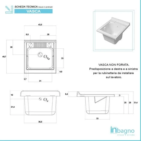 - Dimensioni vasca: L 43,5 x P 49,7 x H 31,4 cm