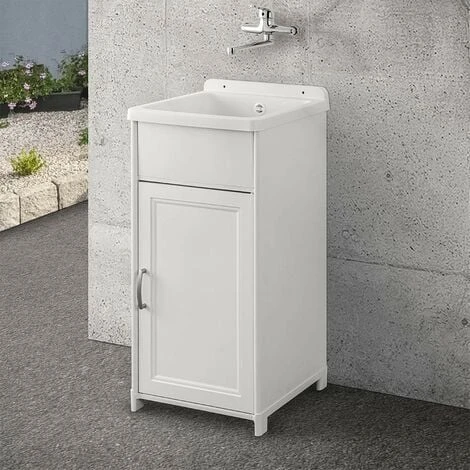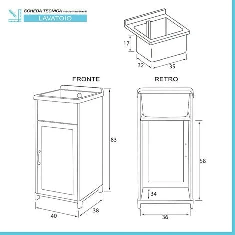 Ha una vasca profonda 17 cm con troppo pieno. All’interno, il mobiletto ha un ampio spazio largo 36 e profondo 34 cm dove poter riporre gli utensili della zona lavanderia.