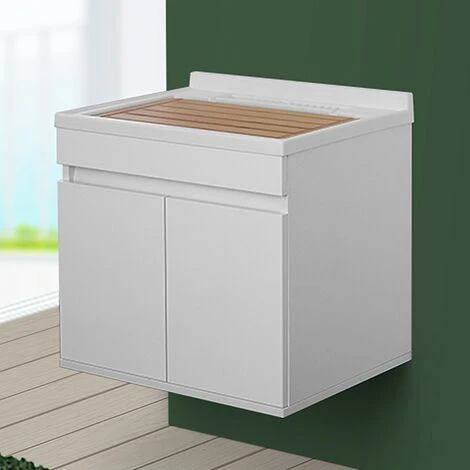 Mobile lavatoio sospeso – 60×50 cm bianco lucido 2 ante con chiusura ammortizzata soft close completo di vasca lavatoio in resina, kit sifone e asse in legno