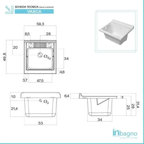 - Dimensioni vasca: L 59,3 x P 49,8 x H 31,4 cm