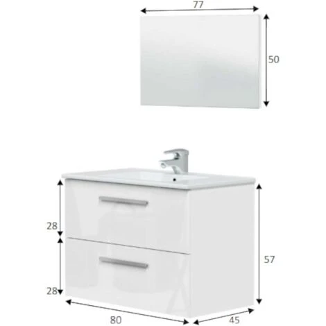 DIMENSIONI IN CM – Mobile sotto lavabo: Lunghezza: 80 Larghezza: 45 Altezza: 57 – Specchio: 80×1,8h57,5 – Capacità cassetto: 73x35h13