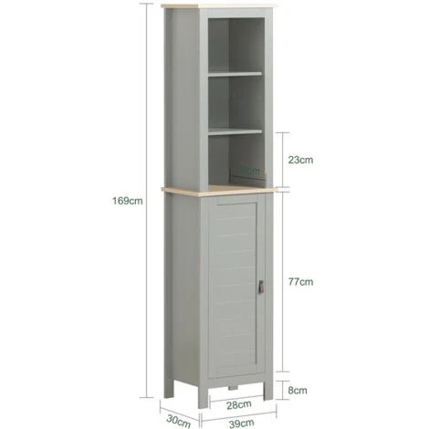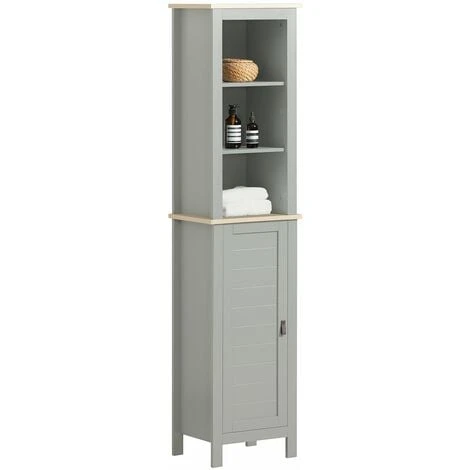 L’ampio mobiletto alto del bagno offre spazio per asciugamani, prodotti per la cura e altri utensili da bagno.
