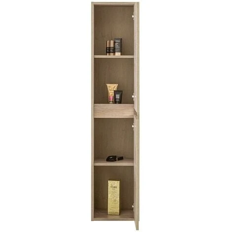 La colonna sospesa è un complemento indispensabile per l’arredo bagno, una soluzione pratica ed economica per contenere tutto il necessario per la cura della persona. Realizzata in legno melaminico resistente agli urti e alle abrasioni, è rifinita in colore rovere alaska con venature chiare ad effetto legno.