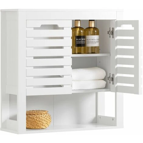 Questo armadietto offre spazio sufficiente dietro le ante a persiana per riporre asciugamani, detersivo, detergente per bagno e altri elementi essenziali per il bagno.