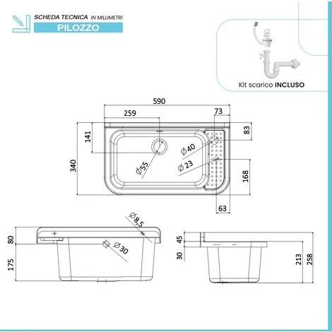 - Sono inclusi il sifone di scarico e la relativa piletta con troppopieno