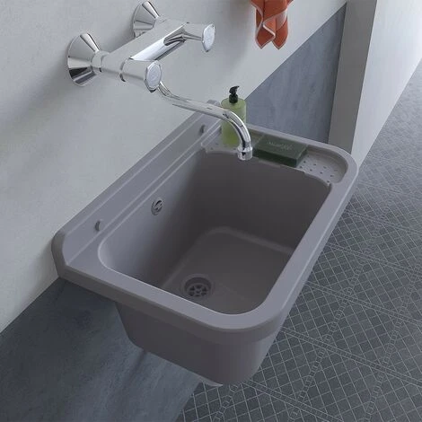 Pilozzo lavatoio a parete 60×34 cm in resina grigia con vano portasapone laterale