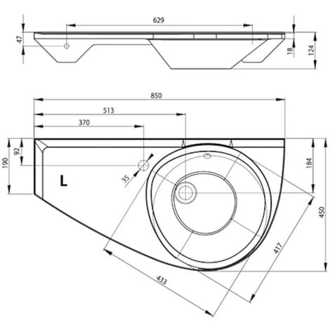 Caratteristiche del lavabo 85x45cm, stile asimmetrico salvaspazio, orientamento a sinistra, con foratura e troppopieno, Ravak Avocado Comfort (XJ1L1100000):