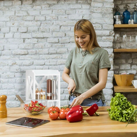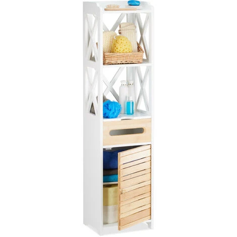 Chi ha una cucina piccola o poco spazio nel bagno non potrà non adorare questo grazioso armadietto. Lo scaffale multiuso in bianco non soltanto non ingombra, bensì è anche una vera e propria attrazione. Nel complesso offre la combinazione di scaffale e armadio con 6 mensole. Sia gli scomparti aperti che quelli chiusi esaudiranno tutti vostri desideri. Infine, la particolarità dello scaffale è lo scomparto con ripiano ribaltabile e dispenser. Così salviettine e rotoli di carta da cucina saranno sempre a portata di mano.