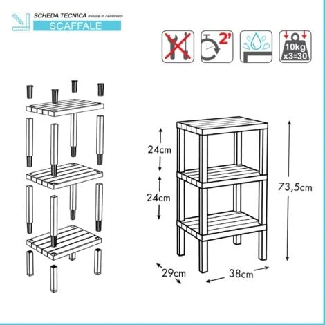 Si compone di 3 ripiani dalla portata massima di 10 kg ciascuno, adatti quindi anche per carichi particolarmente pesanti.