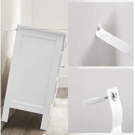 Pannelli MDF di qualitàIl mobile da bagno è realizzato con pannelli MDF di alta qualità e ha anche una superficie liscia al tatto e facile da pulire. | Pratici pomelli cromatiI pomelli cromati aggiungono un tocco decorativo al mobile e aiutano ad aprire e chiudere facilmente le ante. | Cerniere resistentiQuesto mobile da bagno è dotato di robuste cerniere in metallo per una lunga durata. |