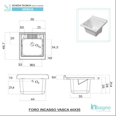 - Dimensioni foro incasso vasca: 44 x 35 cm