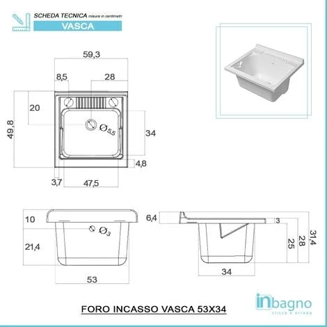 - Dimensioni foro incasso vasca: 53 x 34 cm