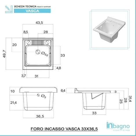 - Dimensioni foro incasso vasca: 33 x 36,5 cm