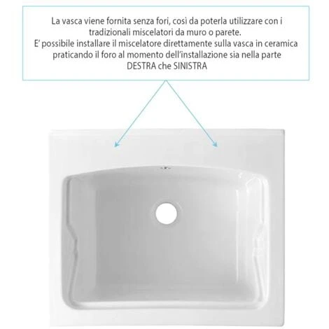 La vasca lavatoio da incasso è completa di troppo pieno per evitare che l’acqua in eccesso strabordi e fuoriesca causando possibili allagamenti. La vasca lavatoio ceramica è disponibile anche con foro a destra o a sinistra, nel caso in cui la si voglia già forata.
