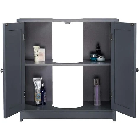 Il mobiletto con ante offre spazio abbastanza per la carta igienica. asciugamani. detersivo. detergente per la toilette e altri piccoli oggetti da tenere.
